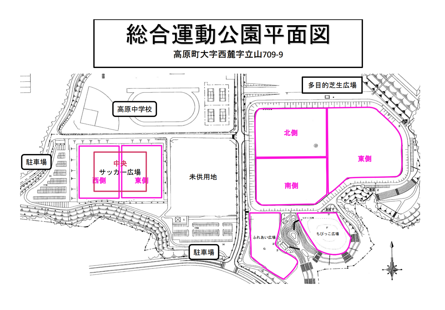 | 施設設備 | 天然芝ピッチ5面(夏芝)、多目的広場、ふれあい広場、ちびっこ広場、照明(1面)、トイレ、駐車場(西側・南側) |